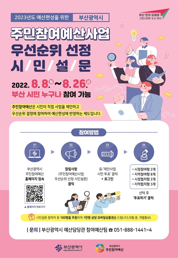 부산시는 내년도 주민참여예산사업 선정을 위한 시민 설문조사를 오는 26일까지 진행한다고 8일 밝혔다.