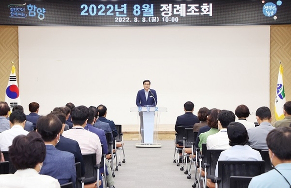 진병영 군수는 이날 정례조회에서 '힘찬도약! 함께여는 함양'을 향해 앞으로 나아가기 위해 ▲공정한 행정, 군정의 혁신 ▲공약사업 추진과 성장동력 발굴을 위한 재원마련 ▲재해·재난 사전예방 및 축제 준비 등 3가지를 당부했다.