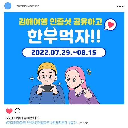 김해문화재단이 여름 휴가철을 맞아 지역 대표관광지 홍보를 위해 SNS 온라인 이벤트 ‘김해여행 인증샷 공유하고 한우먹자!’를 오는 15일까지 실시한다.