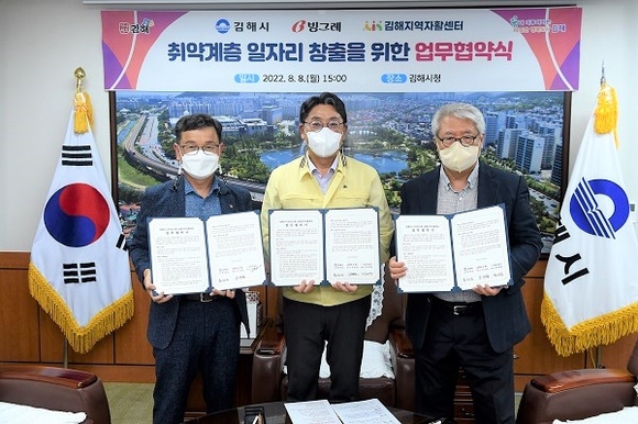 경남 김해시와 김해지역자활센터, ㈜빙그레는 8일 시청에서 근로 능력이 있는 저소득 취약계층의 일자리 창출과 성공적인 자립을 돕는 복지협력망 구축 업무협약(MOU)을 체결했다.