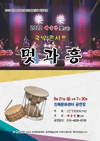 창원에서 활발히 활동하고 있는 공연단체 예술단 樂(락)이 창원문화재단 공연예술지원사업으로 오는 21일 오후 7시 30분 진해문화센터 공연장에서 '국악 콘서트-멋과 흥'을 개최한다.
