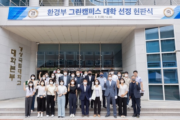 경상국립대학교는 환경부 주관 ‘2022년 그린캠퍼스 조성 지원사업’ 대상 대학으로 선정돼 9일 오후 2시 칠암캠퍼스 대학본부에서 ‘그린캠퍼스 대학 현판식’을 개최했다.