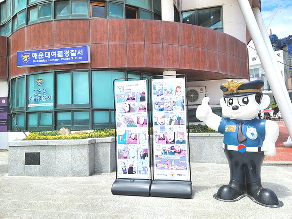 와이즈유 영산대학교 Art&Tech대학 웹툰학과가 부산 해운대경찰서와 함께 휴가철 해수욕장 성범죄 예방을 위한 웹툰 전시를 9일 진행 중이다.