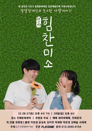 창원문화재단이 주최하고 극단 플레이돔이 주관하는 연극 '힘찬 미소'는 창원지역 예술단체들의 창의적 활동을 안정적으로 지원하고, 이를 통해 예술인들의 자긍심 고취는 물론 창작활동으로 생산된 고품격 예술프로그램을 시민들과 함께 향유하기 위한 '2022 공연예술단체 지원사업'을 통해 선보인다.