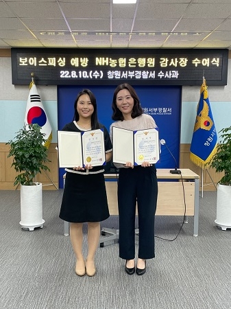 NH농협은행 경남본부는 창원중앙금융센터의 박수정 과장과 이민진 계장이 보이스피싱 금융사기예방공로로 창원서부경찰서로부터 감사장을 받았다고 밝혔다.
