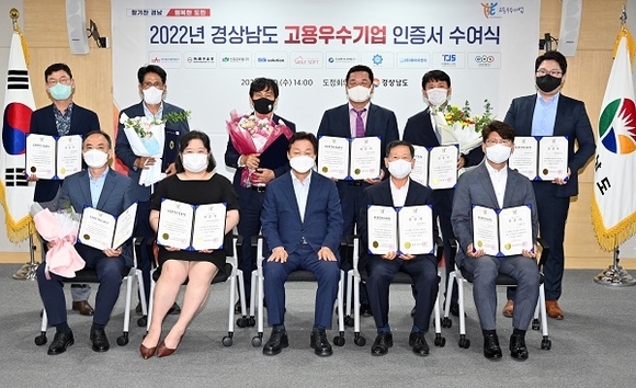 경남도는 10일 도청 도정회의실에서 최근 1년간 일자리 창출과 고용 안정에 기여한 10개 기업을 '2022년 고용우수기업'으로 선정하고, 기업대표 등 30여 명이 참석한 가운데 인증서 수여식을 가졌다.