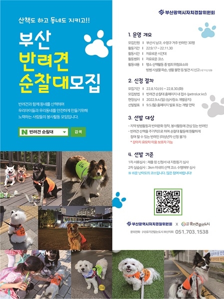 부산시 자치경찰위원회는 시민과 함께하는 맞춤형 치안정책으로 반려견과 함께 산책하면서 지역 방범 활동을 펼치는 '부산 반려견 순찰대'를 시범 운영하고, 참가자를 오는 30일까지 모집한다고 11일 밝혔다.