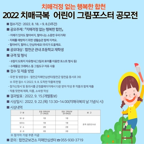 경남 합천군 치매안심센터는 다음달 21일 '치매극복의 날'을 맞아 '2022 치매극복 어린이 그림·포스터 공모전'을 연다고 11일 밝혔다.