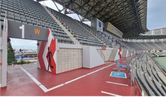 적용된 디자인은 관람석 출입구 벽면의 경우 그림문자(픽토그램)와 방향표시 도색을 해 운동장 어느 공간에서도 시각적으로 출입구임을 직관적으로 알 수 있도록 했다.