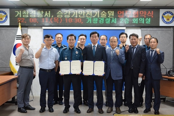 한국승강기안전공단 부설기관인 승강기안전기술원과 거창경찰서가 지난 11일 업무협약을 체결한 뒤 관계자들이 기념촬영을 하고 있다.