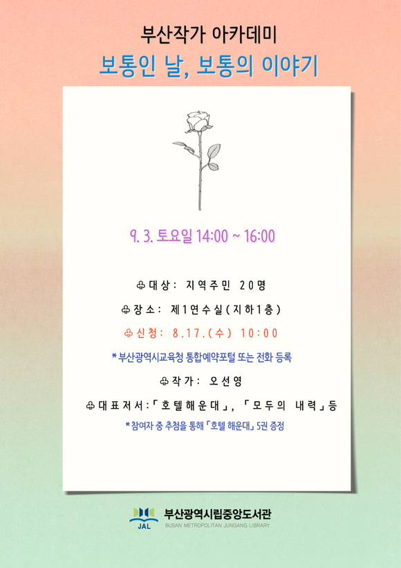 부산시립중앙도서관은 '보통인 날, 보통의 이야기' 특강 참가자를 17일부터 모집한다고 밝혔다.