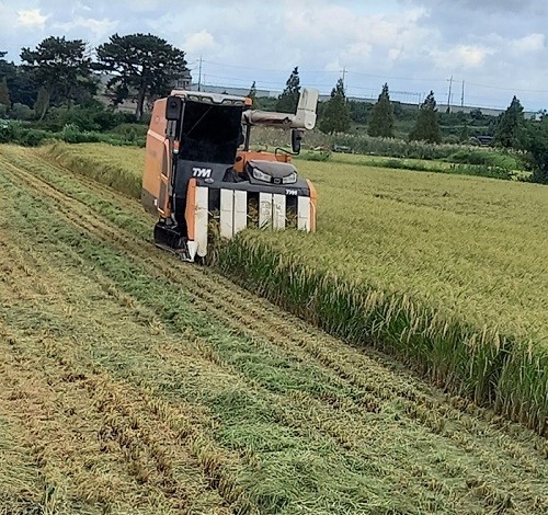 지난 15일 경남 사천시 용현면 온정리 259번지 외 1필지 조진규 씨 논에서 올해 첫 벼베기가 실시됐다. 조 씨 농가에서 수확한 벼는 지난 4월 초에 파종해 5월에 이앙한 조생종인 해담벼로 조기 재배에 좋으며, 쌀알이 작으면서 맑고 윤기가 흐르는 우수한 밥맛으로 알려진 품종이다. (사진=사천시 제공)