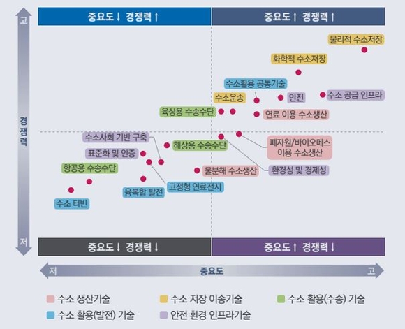 BISTEP의 실태조사 결과에 따르면, 동남권 수소산업에서 중요도와 경쟁력이 모두 높은 핵심기술로는 물리적 수소저장, 화학적 수소저장, 수소 공급 인프라, 안전 등이 도출됐다. 핵심기술의 개발과 사업화를 위해서는 원천 기술개발 지원, 상용화 기술개발 지원 등에 대한 수요가 존재했다.