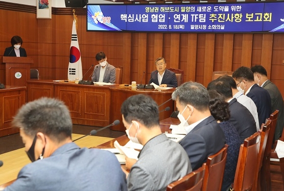 경남 밀양시는 18일 시정 주요 핵심사업 간 협업 체계를 구축해 운영 중인 2022년 협업 TF팀의 중간보고회를 가졌다.