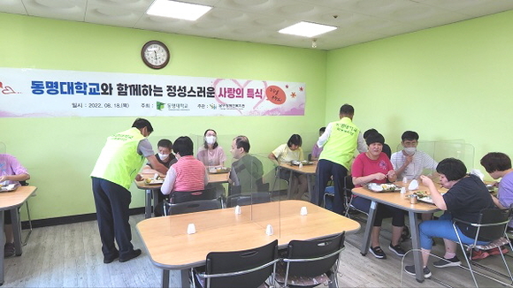 동명대학교 사회봉사단 교직원 및 재학생 9명은 지난 18일 남구장애인복지관에서 동명대와 함께하는 정성스러운 사랑의 특식 나눔 봉사활동을 가졌다.