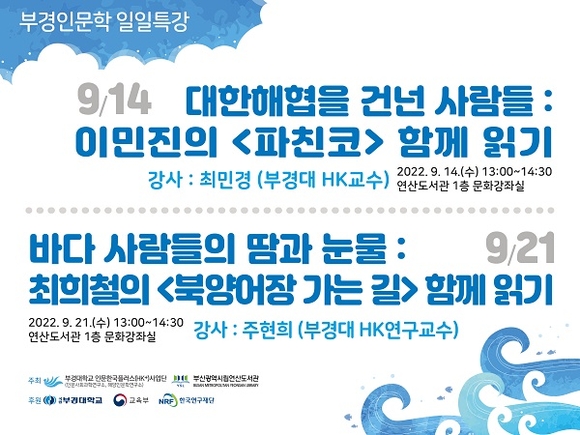 국립부경대학교 인문한국플러스(HK+)사업단과 부산광역시립연산도서관은 다음달 14일과 21일 연산도서관 1층 문화강좌실에서 2회에 걸쳐 ‘부경인문학 일일특강’을 연다.