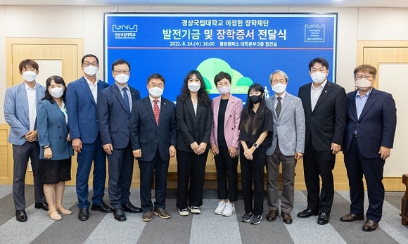 경상국립대학교는 24일 칠암캠퍼스 대학본부 5층 접견실에서 ‘경상국립대학교 이정한 장학재단 발전기금 전달 및 장학증서 수여식’을 개최했다. 행사는 권순기 총장, 김곤섭 연구부총장, 권선옥 학생처장과 이정한 전 총장의 차녀 이동임 씨 부부, 장학생 2명 등 10여 명이 참석해 간소하게 열렸다.