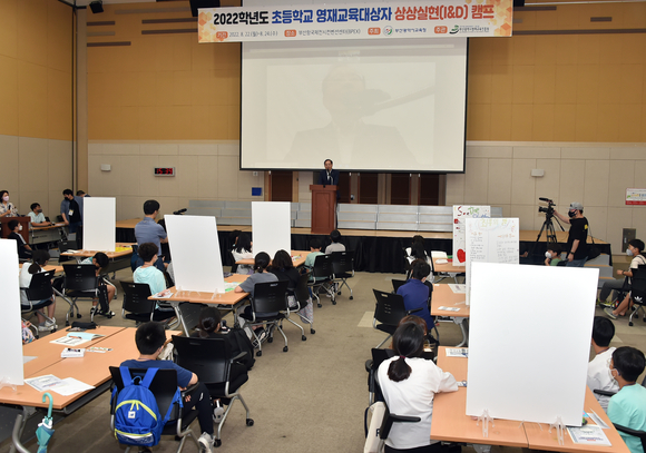 하윤수 부산시교육감이 24일 오후 부산항국제전시컨벤션센터에서 초등학교 5학년 120여명이 참석한 가운데 열린 '초등학생 상상실현 캠프 시상식'에서 인사말을 하고 있다. 하 교육감은 "오늘 참석한 학생들은 부산의 초등 영재로서 자긍심을 갖고, 주변 친구들과 우리 사회를 위해서 꿈을 키워가는 훌륭한 인재로 성장하길 바란다"며 "미래 사회를 이끌어갈 여러분들의 소중한 꿈을 진심으로 응원하겠다"고 말했다.