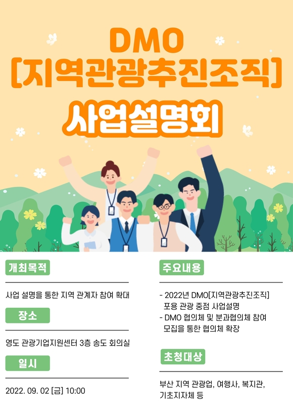 부산관광공사는 2022 지역관광추진조직(DMO) 사업설명회를 오는 9월 2일 오전 10시에 영도에 있는 부산관광기업지원센터 3층 송도 회의실에서 개최한다고 25일 밝혔다.