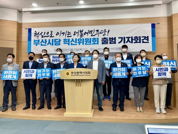 민주당 부산시당은 25일 시의회 브리핑룸에서 기자회견을 열고 혁신위 출범을 선언했다. 혁신위는 위원장을 포함한 외부 위원 5명, 지역별 권리당원 1명, 기초의원 1명, 당내 위원 36명 등 총 41명으로 구성된다. 위원장은 동의대학교 유동철 교수가 맡는다.
