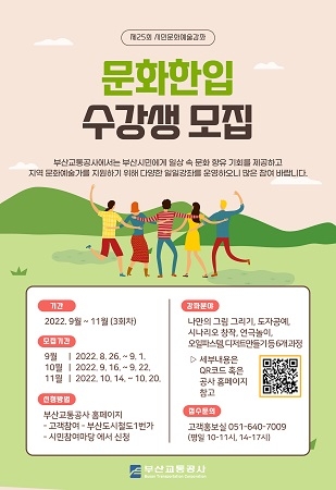 부산교통공사는 2022년 하반기 제25회 부산교통공사 시민문화예술강좌를 개설, 수강생을 모집한다고 25일 밝혔다. 이번 강좌 사업은 시민들의 문화활동을 지원하기 위해 마련됐다.