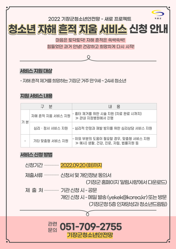 서비스 신청은 기장군 거주 만 9~24세 청소년 중 자해 흉터 제거를 희망하는 위기청소년 누구나 가능하다.