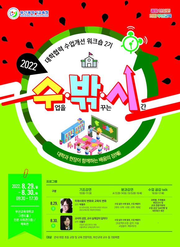 부산시교육청은 29일과 30일 부산교육대학교 그랜드홀 등지에서 대학협력 수업개선 워크숍 2기 '수·밖·시(수업을 바꾸는 시간)'를 개최한다고 29일 밝혔다.