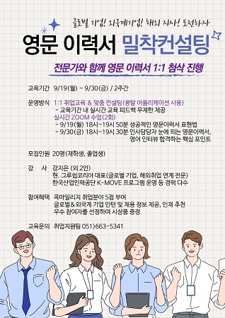 경성대학교 대학일자리플러스센터가 오는 9월 19일부터 30일까지 2주간 글로벌 기업 취업에 대한 학생의 수요를 반영해 영문 이력서 밀착컨설팅을 진행한다.