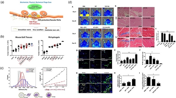 이에 연구팀은 세포외 기질을 모방하는 아르기닌-글리신-아스파스트산을 나노섬유구조의 몸 전체에 발현하도록 재조합된 M13파지(이하 ‘생체모방 바이러스’)를 개발하고, 이 생체모방 바이러스가 허혈성 질환을 치료하기 위해 손상된 연조직 내에서 만들어내는 필수 치료신호를 전달하는 데에 그 자신의 생화학적·위상학적 신호와 함께 연조직 재활을 위한 특정 탄성 및 기계적 신호를 통해 특정 치료적 미세환경을 제공한다는 사실을 발견했다. 즉 생체모방 바이러스를 허혈성 질활모델에 이식했을 때 허혈조직이 회복된 것이다.