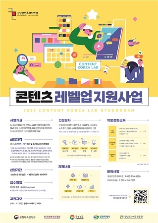 경남문화예술진흥원이 운영하는 경남콘텐츠코리아랩은 도내 콘텐츠 기업의 사업화 지원을 위한 ‘2022 콘텐츠 레벨업 지원사업 프로그램’의 참여기업을 모집한다.