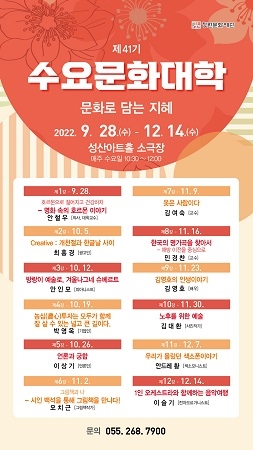 창원문화재단은 ‘명사와 함께하는 문화예술특강-제41기 수요문화대학’을 오는 9월 개강한다. 이번 41기는 '문화로 담는 지혜'라는 소제목으로, 다양한 분야의 전문가들을 초청해 삶의 지혜와 교양을 쌓아보는 시간을 마련했다.