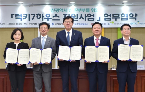부산시는 30일 BNK부산은행, 한국주택금융공사, 한국토지주택공사, 부산도시공사와 공동으로 '부산시 신혼부부 럭키7 하우스 지원 사업' 업무협약을 체결했다고 밝혔다.