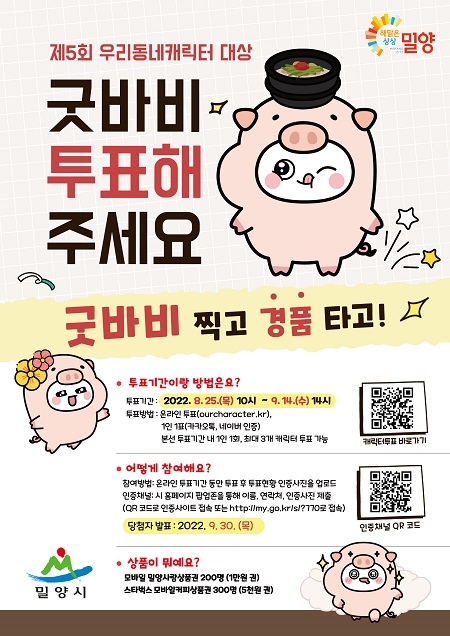 양기규 관광진흥과장은 “밀양돼지국밥 캐릭터 '굿바비'에 투표 꼭 부탁드린다”며 “다가오는 추석에 명절 인사와 함께 투표를 독려하는 등 굿바비가 글로벌 캐릭터로 도약할 수 있도록 힘을 보태주시기 바란다”고 말했다.