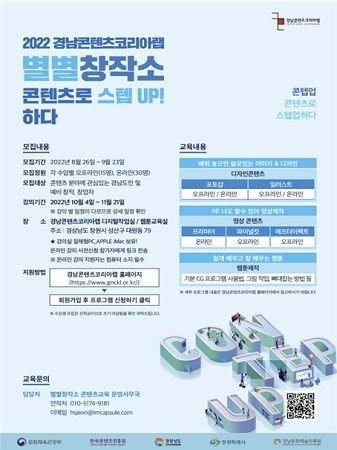 모집은 9월 23일까지이며, 전 과정 무료로 진행된다. 일정 등 자세한 사항은 경남콘텐츠코리아랩 누리집에서 확인할 수 있다.