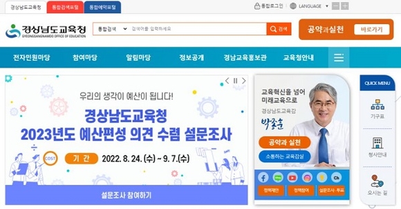 설문은 △교육정책 △재정운영 △예산제도 등의 문항으로 구성돼 있다. 학생·학부모 등 경남 도민이면 누구나 휴대전화나 컴퓨터로 도교육청과 학교 누리집에 접속해 참여할 수 있다.
