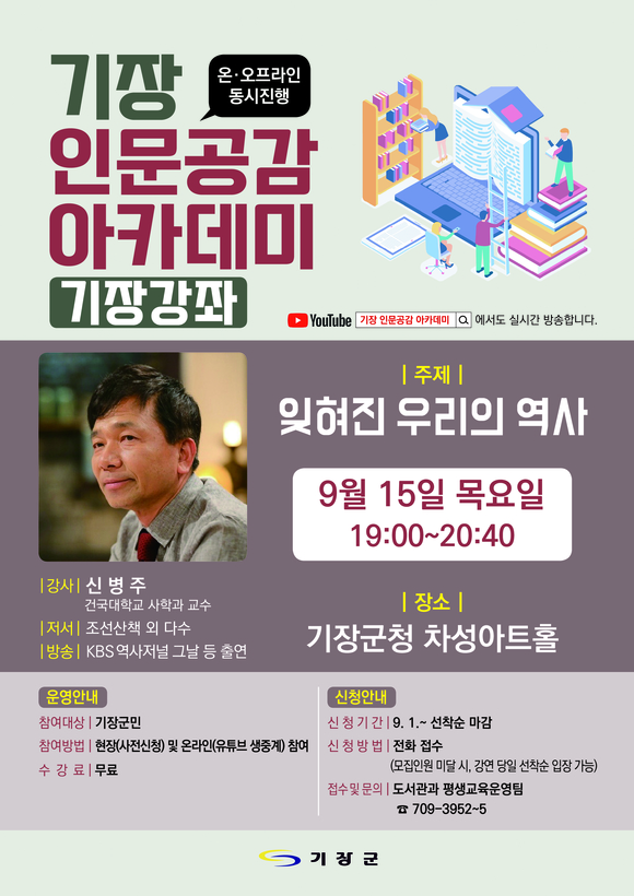 올해 첫 번째 강연은 9월 15일 오후 7시 기장군청 차성아트홀에서 역사학자 신병주 건국대학교 교수가 '잊혀진 우리의 역사'를 주제로 펼친다. 온라인 강연도 함께 실시된다.