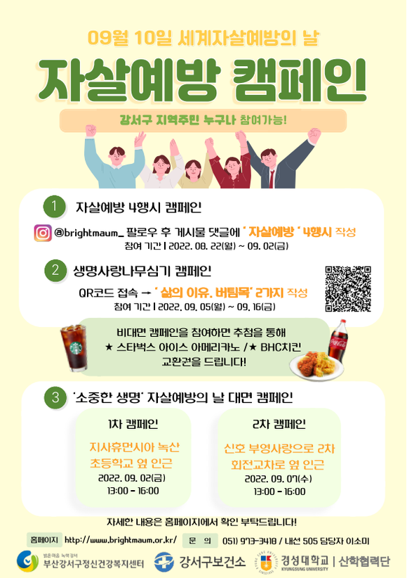 캠페인은 <자살예방 4행시 캠페인>, <생명사랑나무심기 캠페인>, <'소중한 생명' 자살예방의 날 대면 캠페인> 세 가지로 진행된다.