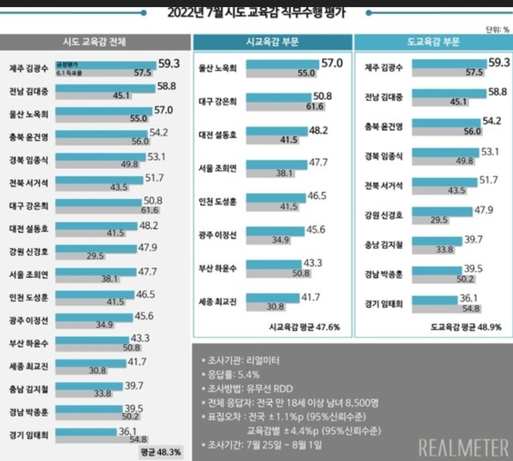 리얼미터 전국 교육감 평가 여론 조사는 유·무선 임의전화걸기 자동응답 방식으로, 지난 7월 25일~8월 1일 전국 18세 이상 8천500명(시도별 500명)을 대상으로 이뤄졌다. 행정안전통계보정은 2022년 6월말 행정안전부 주민등록 인구통계 기준 성별, 연령대별, 권역별 가중치 부여 방식으로 진행됐다. 광역단체별 표본오차는 95% 신뢰수준에서 ±4.4%P, 응답률은 5.4%이다.