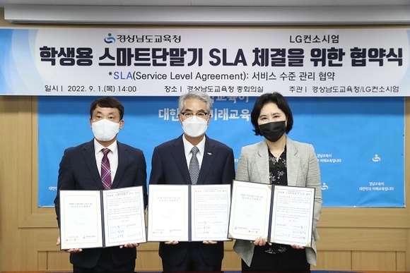 경남도교육청과 LG컨소시엄은 1일 도교육청 중회의실에서 학생용 스마트단말기 보급에 대한 성과를 공유하고, 향후 안정적인 유지보수 지원을 위한 'SLA(Service Level Agreement)' 협약식을 가졌다.