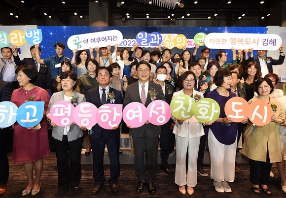 경남 김해시는 1일 양성평등주간을 맞아 김해중소기업 비즈니스센터 5층 대연회장에서 '함께 성장하는 성평등 도시 김해'를 슬로건으로 기념행사를 열고 양성평등 진흥 유공자 10명에 대한 시상과 기념사·축사 및 피켓 퍼포먼스를 가졌다. (사진=김해시 제공)