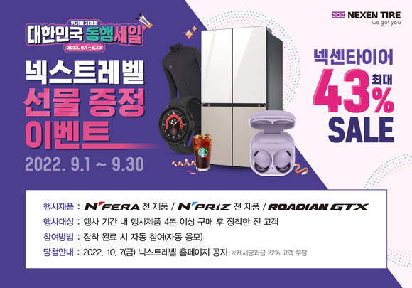 넥센타이어는 '대한민국 동행세일'에 동참하며 제품 할인 및 구매고객 대상 이벤트를 진행한다고 2일 밝혔다.