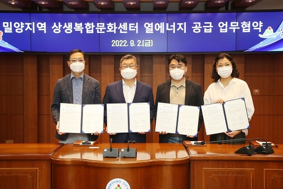 경남 밀양시는 2일 하남산업단지 내 입주예정인 수소연료전지 발전기업 3개사와 수소연료발전소 가동 시 나온 열을 밀양지역 상생복합문화센터로 무상으로 공급하는 업무협약을 체결했다.