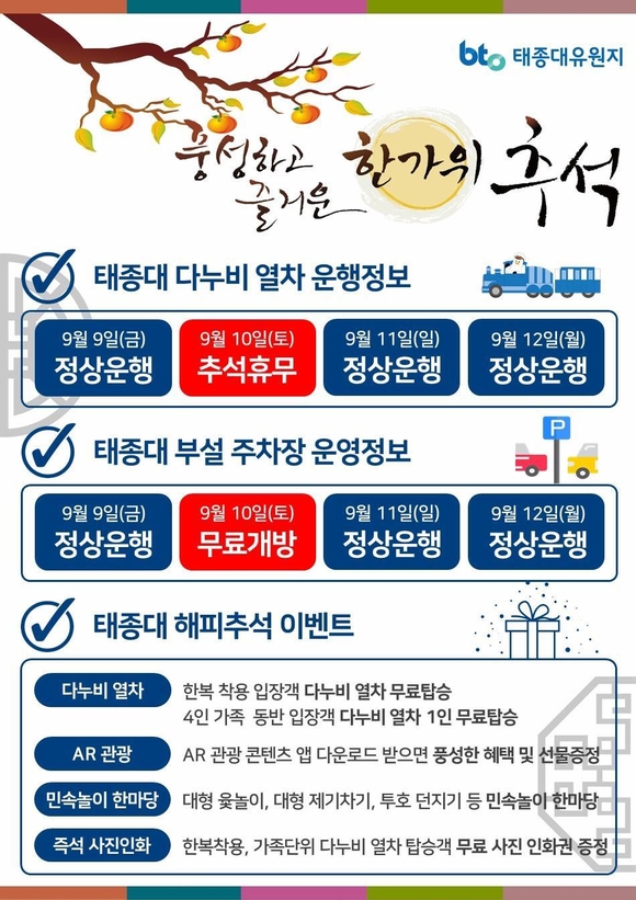 우선, 이 기간 한복을 입고 오는 관광객과 4인 동반가족에게 다누비열차 무료 탑승 혜택이 제공된다. 다만, 추석 당일인 10일에는 운영하지 않는다.