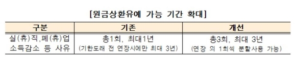 그러나 개선을 통해 실(휴)직·폐(휴)업 등의 사유에 해당되는 고객도 기존 1회(1년 이내)에서 최대 3회(회차별 1년 이내)까지 신청 가능해진다. 이에 따라 실직 및 폐업 등으로 일시적으로 상환에 어려움을 겪는 차주는 총 3회 내에서 1회당 1년씩 분할사용도 가능하며 최대 3년간 원금상환유예를 이용할 수 있게 됐다.