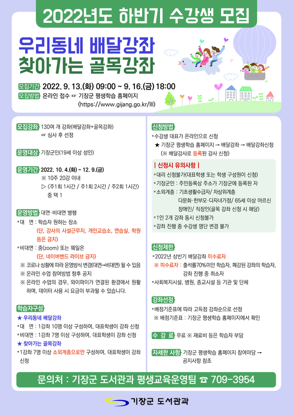 배달강좌 및 골목강좌에 대한 자세한 사항은 기장군 평생학습 홈페이지를 참고하거나, 기장군 도서관과 평생교육운영팀으로 문의하면 된다.