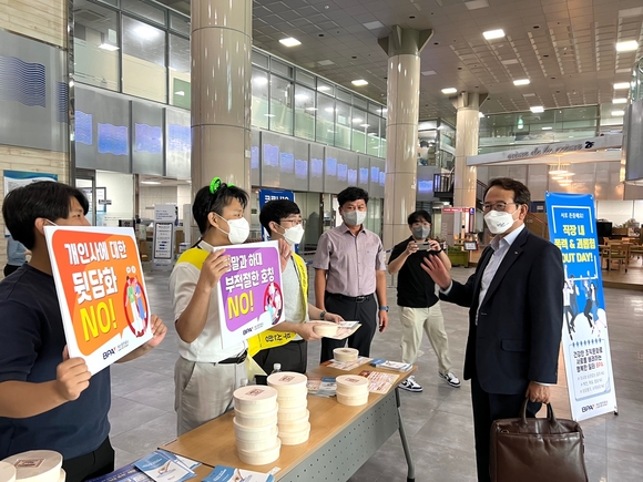 출근길에 직원들이 자연스럽게 폭력과 직장 내 괴롭힘에 대해 경각심을 갖고 중요성을 인식할 수 있도록 직장 내 사례를 토대로 노사가 공동으로 피켓을 제작해 홍보를 진행했다.