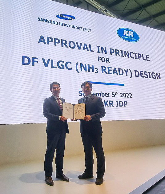 이번 AIP를 받은 대형 가스운반선(VLGC)은 KR과 삼성중공업 간 진행된 공동개발프로젝트의 결실로, 암모니아를 운송하면서 암모니아를 추진 연료로도 사용해 운항 과정에서 탄소를 배출하지 않도록 개발된 친환경선박이다.