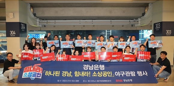 특히 '하나된 경남, 힘내라! 소상공인'과 '활기찬 경남 행복한 도민'이 새겨진 클래퍼를 들고 지역 소상공인들을 응원하는 동시에 NC 다이노스의 승리를 기원하는 열띤 응원전을 펼쳤다.