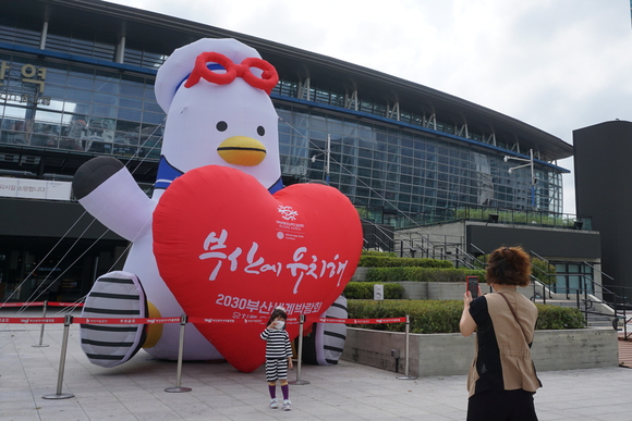 부산시설공단은 오는 18일까지 부산역 광장에서 2030부산세계박람회 유치를 기원하는 높이 6m의 초대형 '부기' 풍선 인형을 전시한다고 13일 밝혔다.