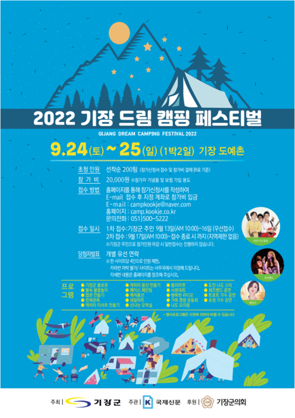 참가 신청은 기장드림캠핑페스티벌 홈페이지를 통해 선착순으로 200팀을 모집한다. 1차 접수는 13일부터 기장군 주민에 한해 우선적으로 신청 가능하고, 2차 접수는 17일부터 지역 제한 없이 누구나 신청할 수 있다.